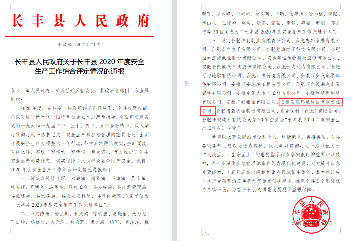 近日,长丰县人民政府公布了长丰县2020年度安全生产工作综合评定结果,8188www威尼斯荣获 “长丰县2020年度安全生产工作先进企业”称号。